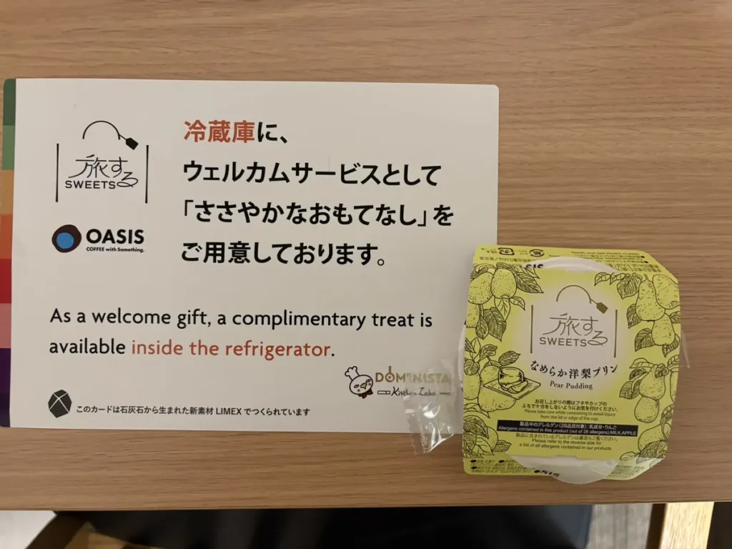 上では池袋を紹介していますが、どのドーミーインでも、チェックイン後に客室の冷蔵庫を開けると、「旅するSWEETS」というゼリーやレモンケーキ、チーズケーキなどのウェルカムスイーツが基本用意されています。